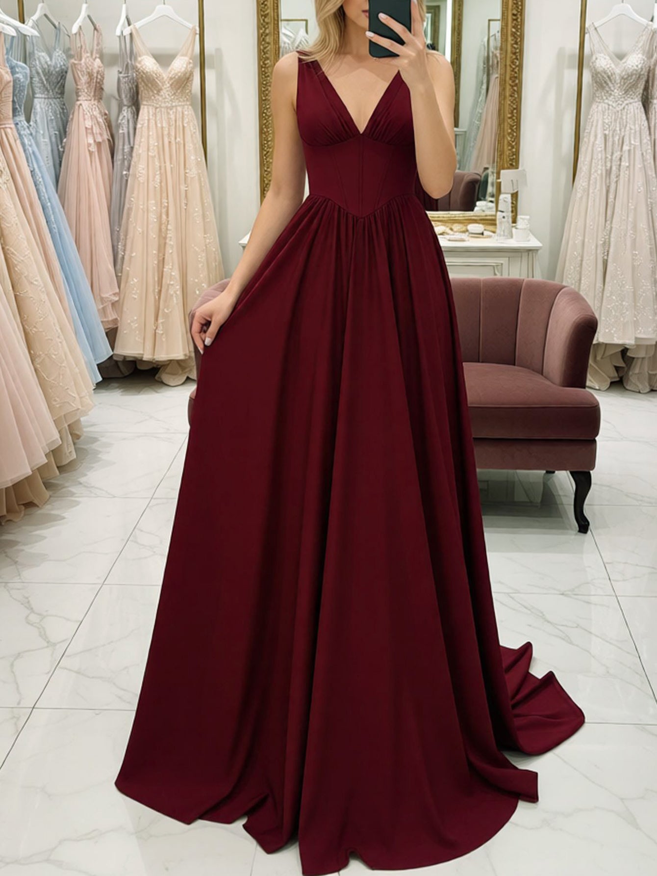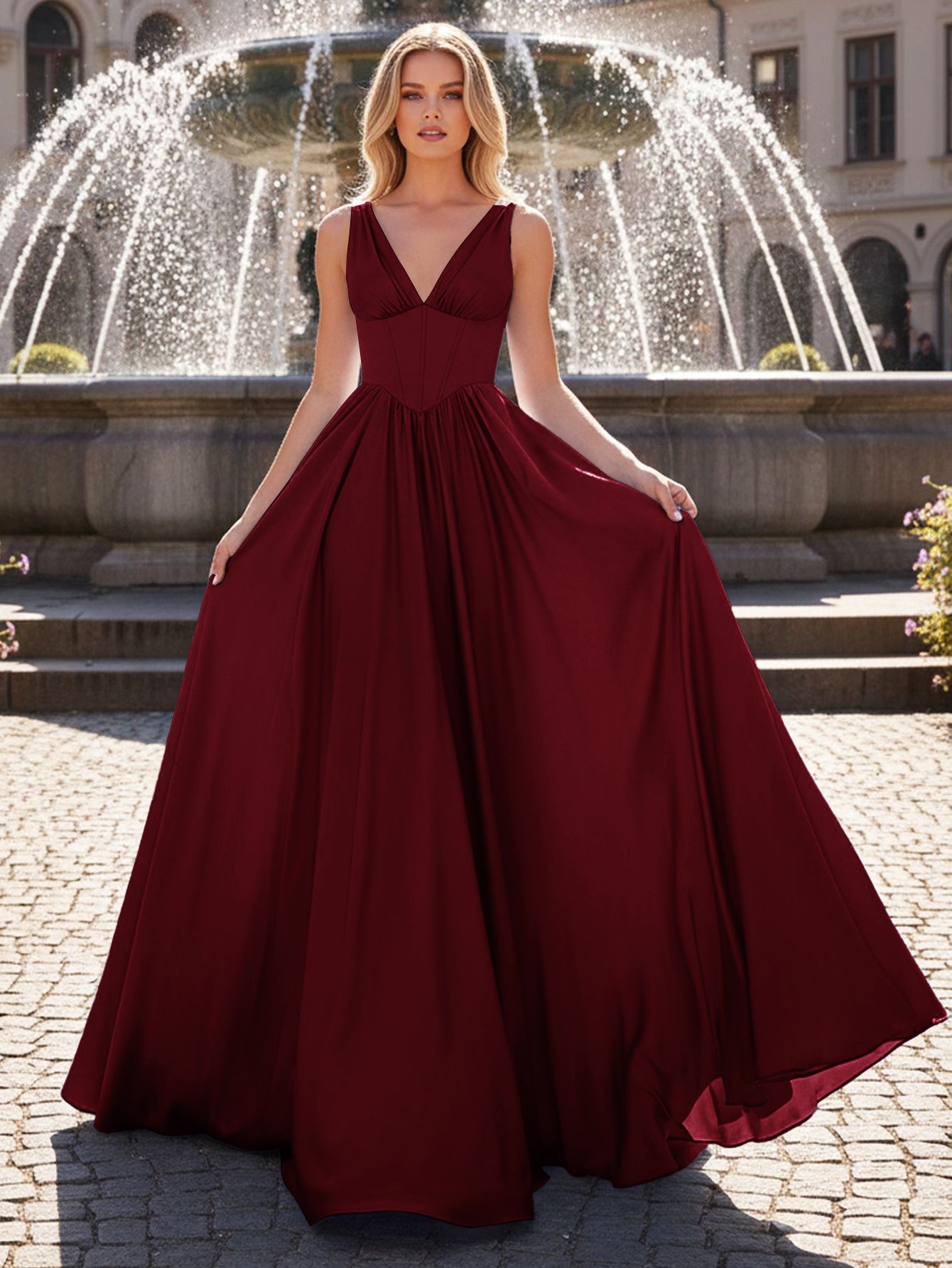 Tank Top Boned V Neck Ball Gown Prom Dress - Burgundy