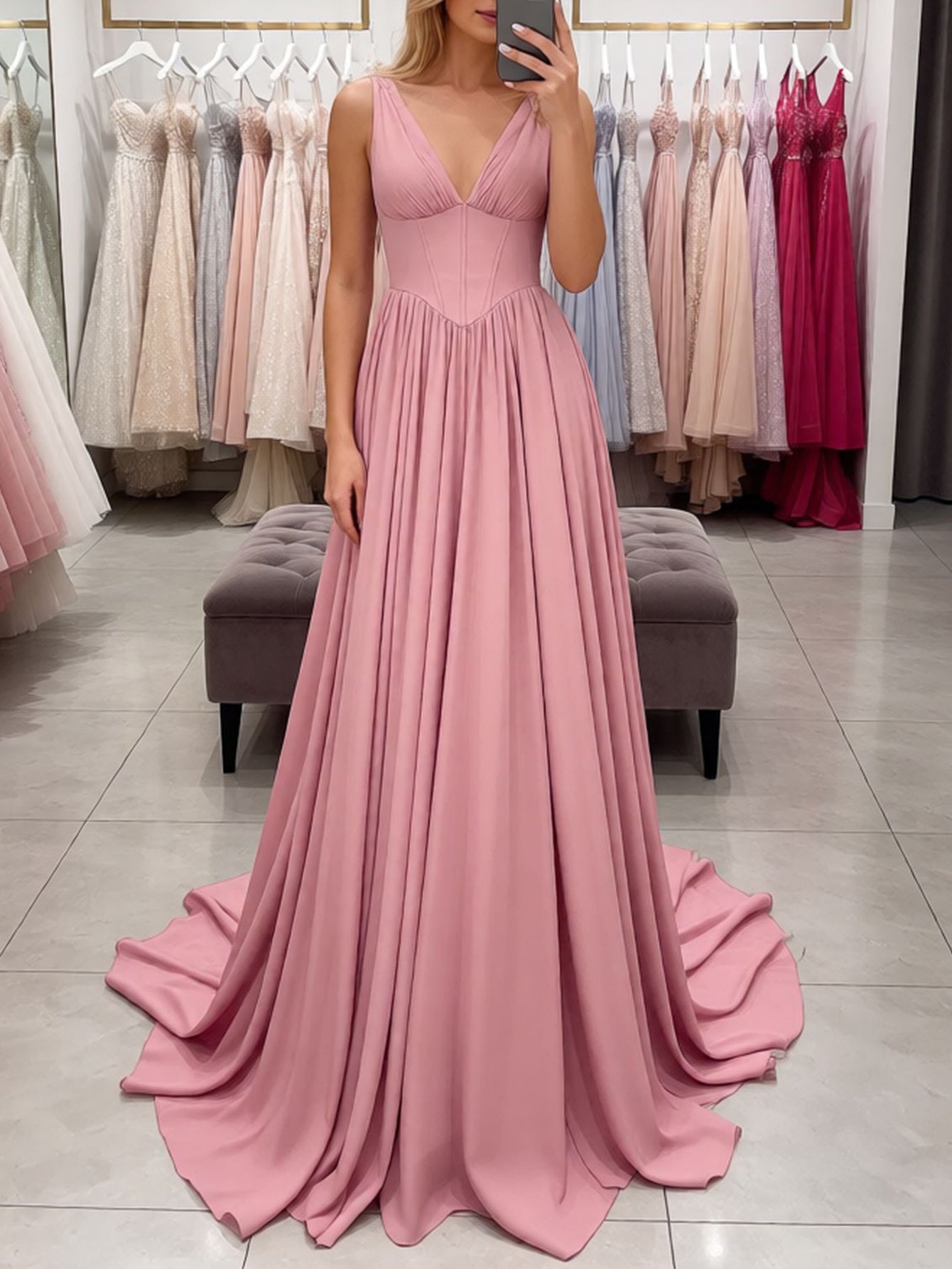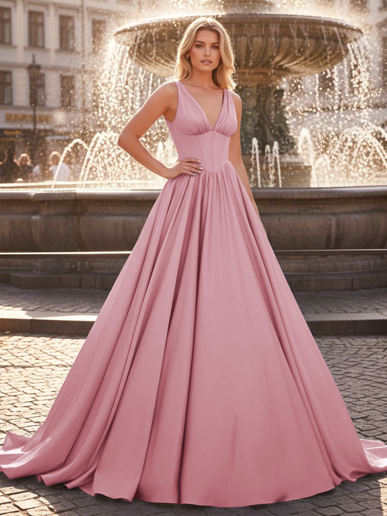 This satin prom gown features boned with crystals on the bodice. The tank top evening dress has a V-neck and pleated hem. This classy ball gown dress is ideal for party, evening or festivals.