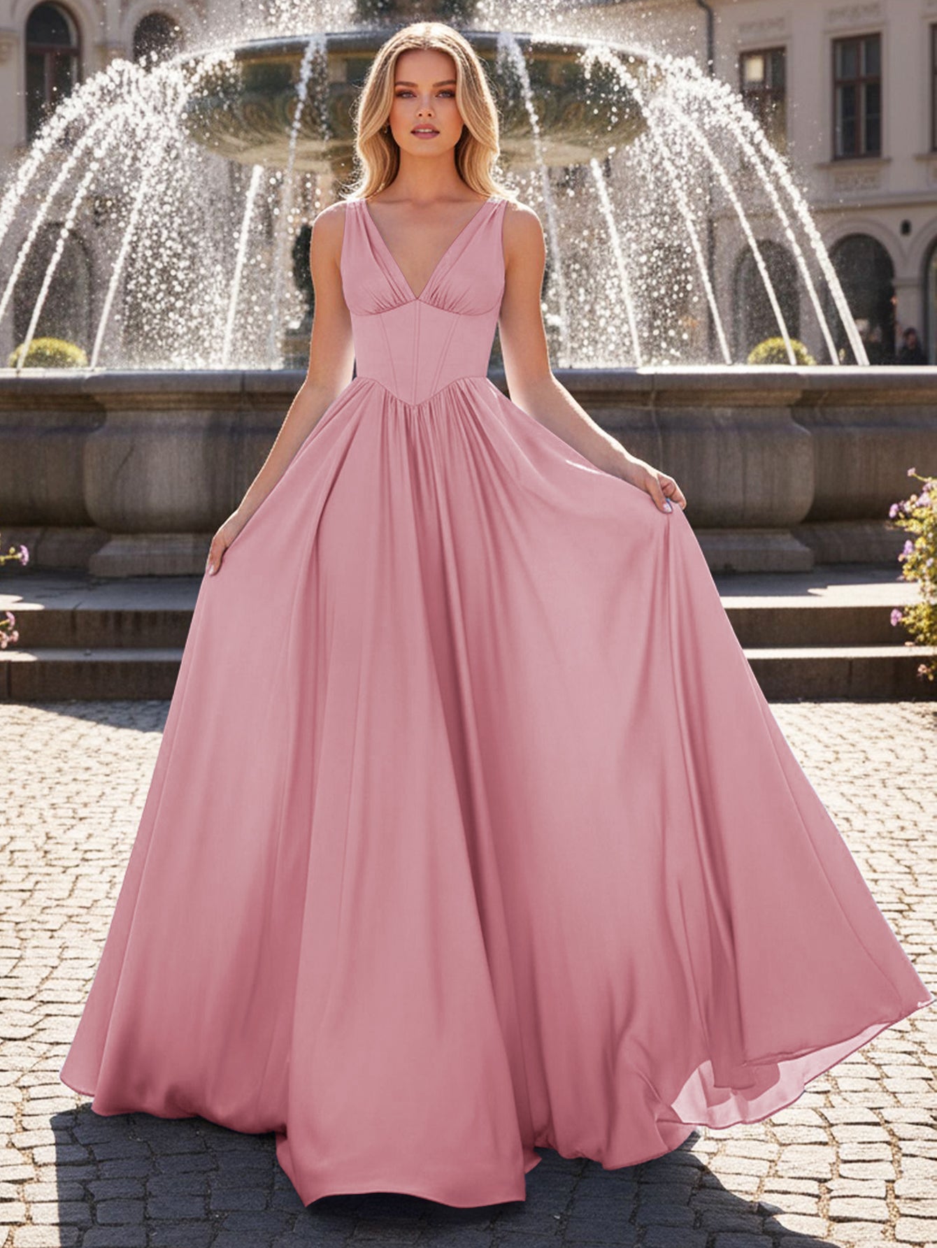 Tank Top Boned V Neck Ball Gown Prom Dress - Pink