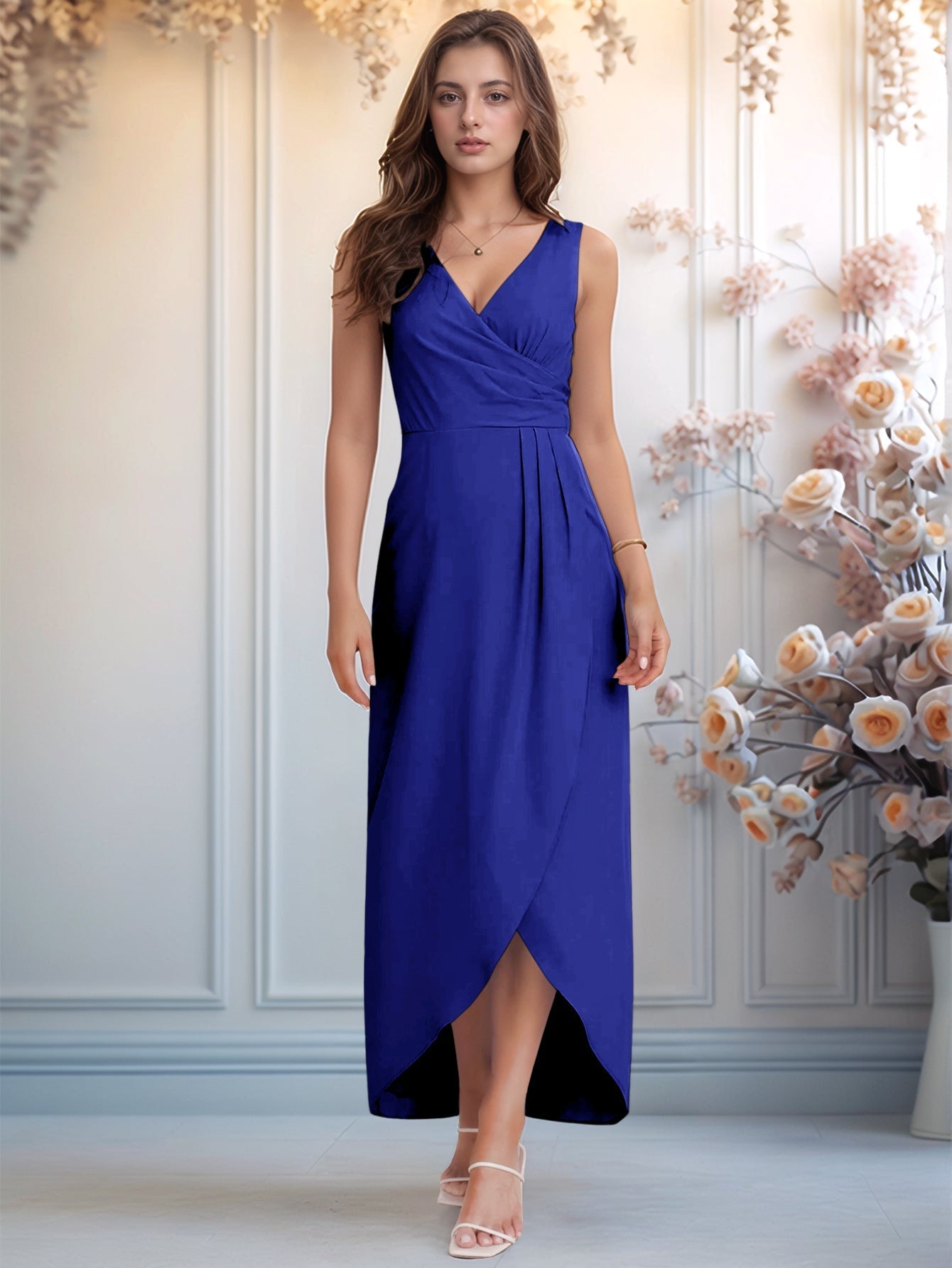 Tank Top Pleats Ankel Chiffon V-Neck Bridesmaid Dress - Royal Blue