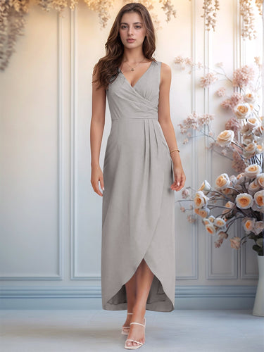 Tank Top Pleats Ankel Chiffon V-Neck Bridesmaid Dress - Silver