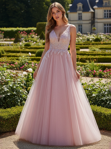 Tank V-Neck Embroidery Sheer Long Ball Gown Prom Dress - Blush Pink