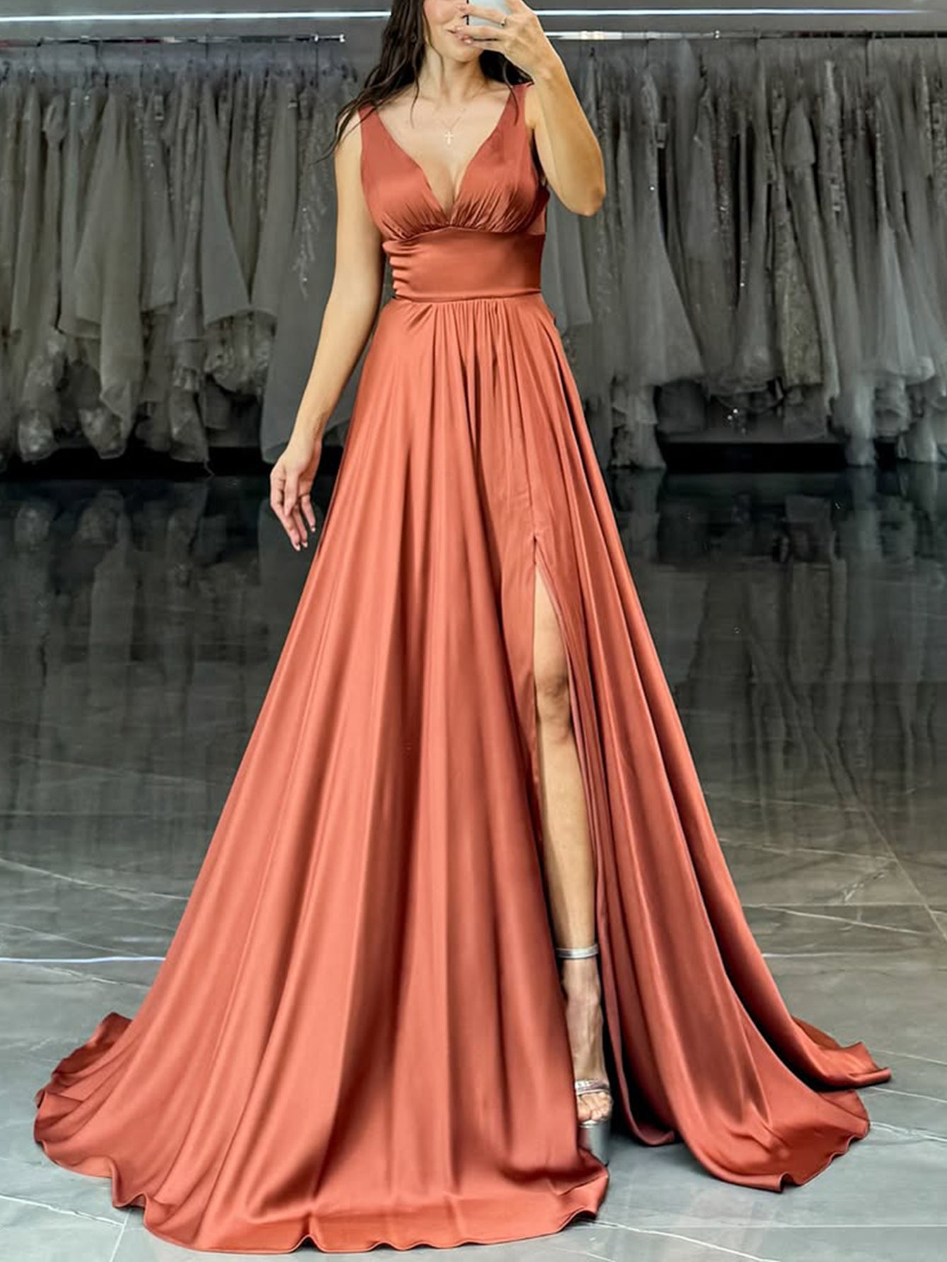 This satin prom gown features fitted waist on the bodice. The tank dress has a deep V-neckline and pleated split hem. Worldprom ball gown prom dresses are ideal for party, evening or festivals.