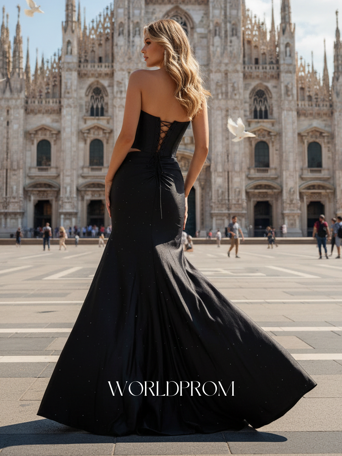 This satin prom gown features ruched bust on the bodice. The strapless dress has a scoop neckline and split hem. Worldprom mermaid prom dresses are ideal for party, evening or festivals.