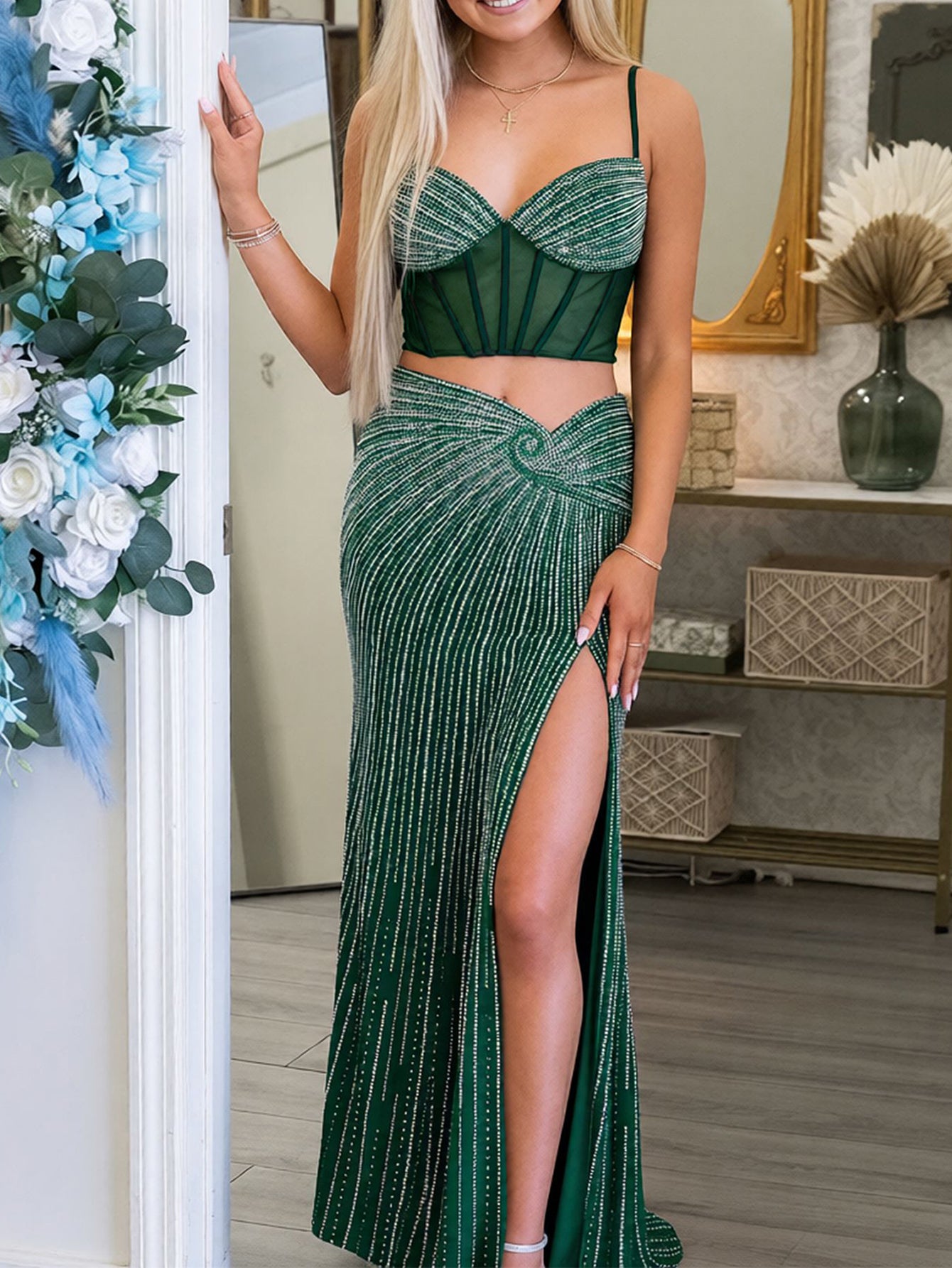 Two Pieces Sparkly Beading Illusion Bodice Mermaid Prom Dress With Slit - Emerald Green