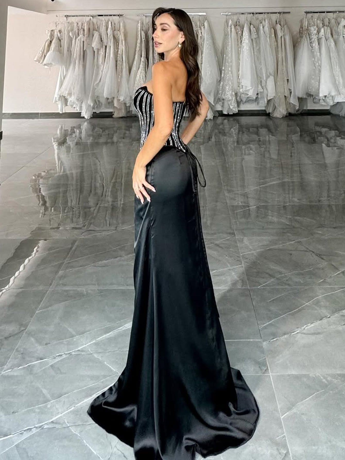 This satin prom gown features sparkly beading on the illusion bodice. The strapless dress has a scoop neckline and split hem. Worldprom mermaid prom dresses are ideal for party, evening or festivals.