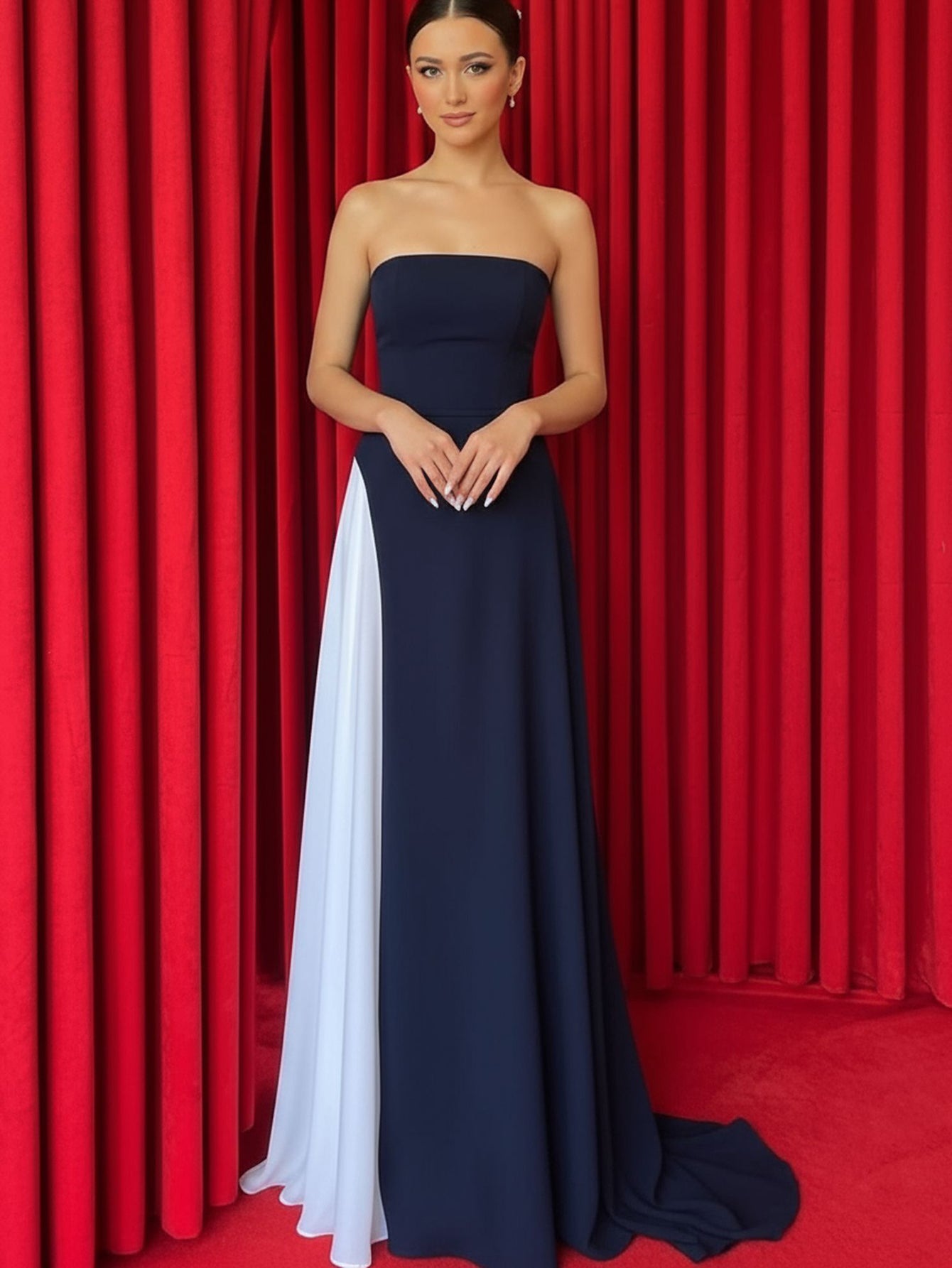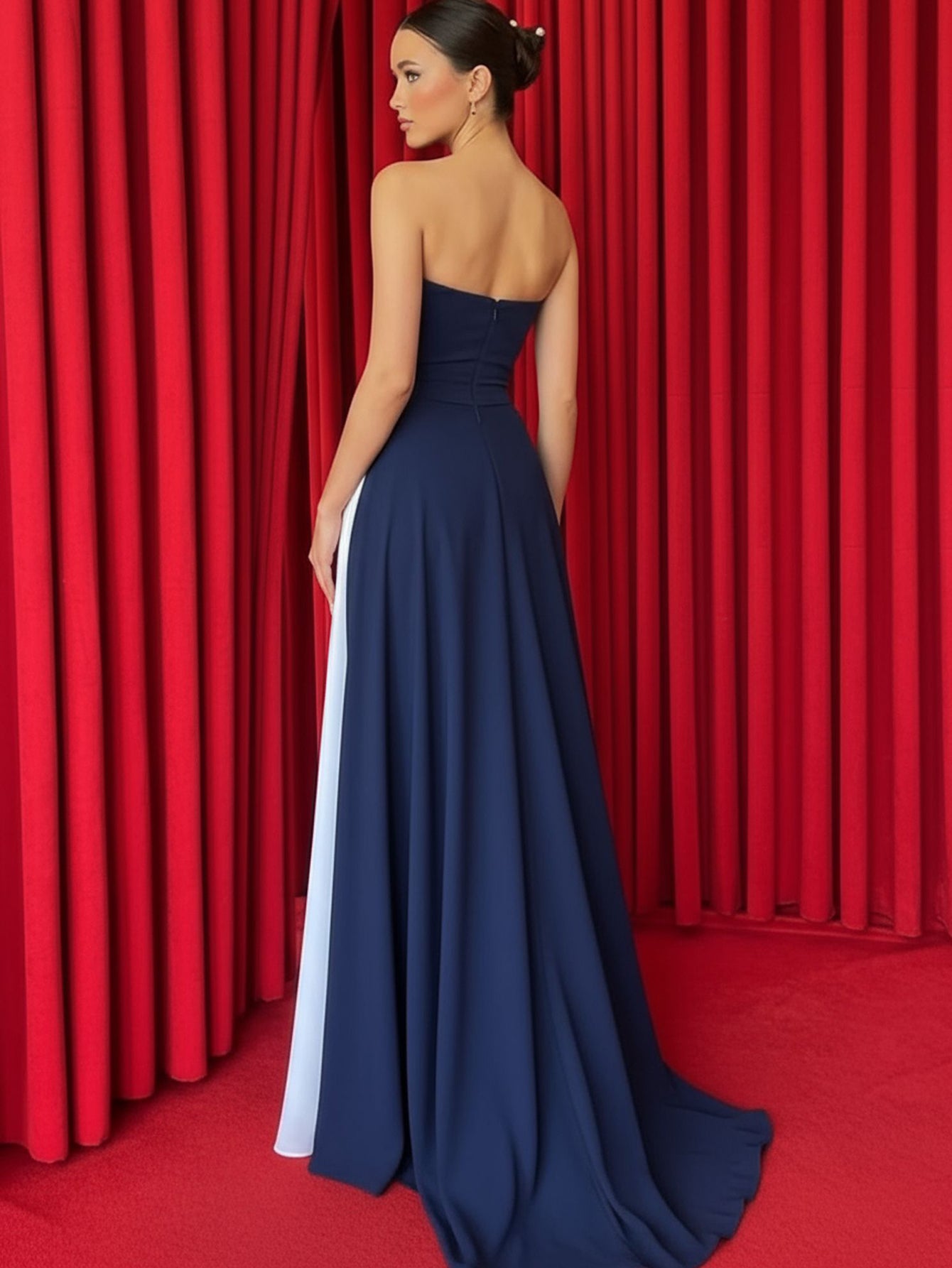 Two Pieces Strapless A-Line Long Prom Dress - Navy Blue