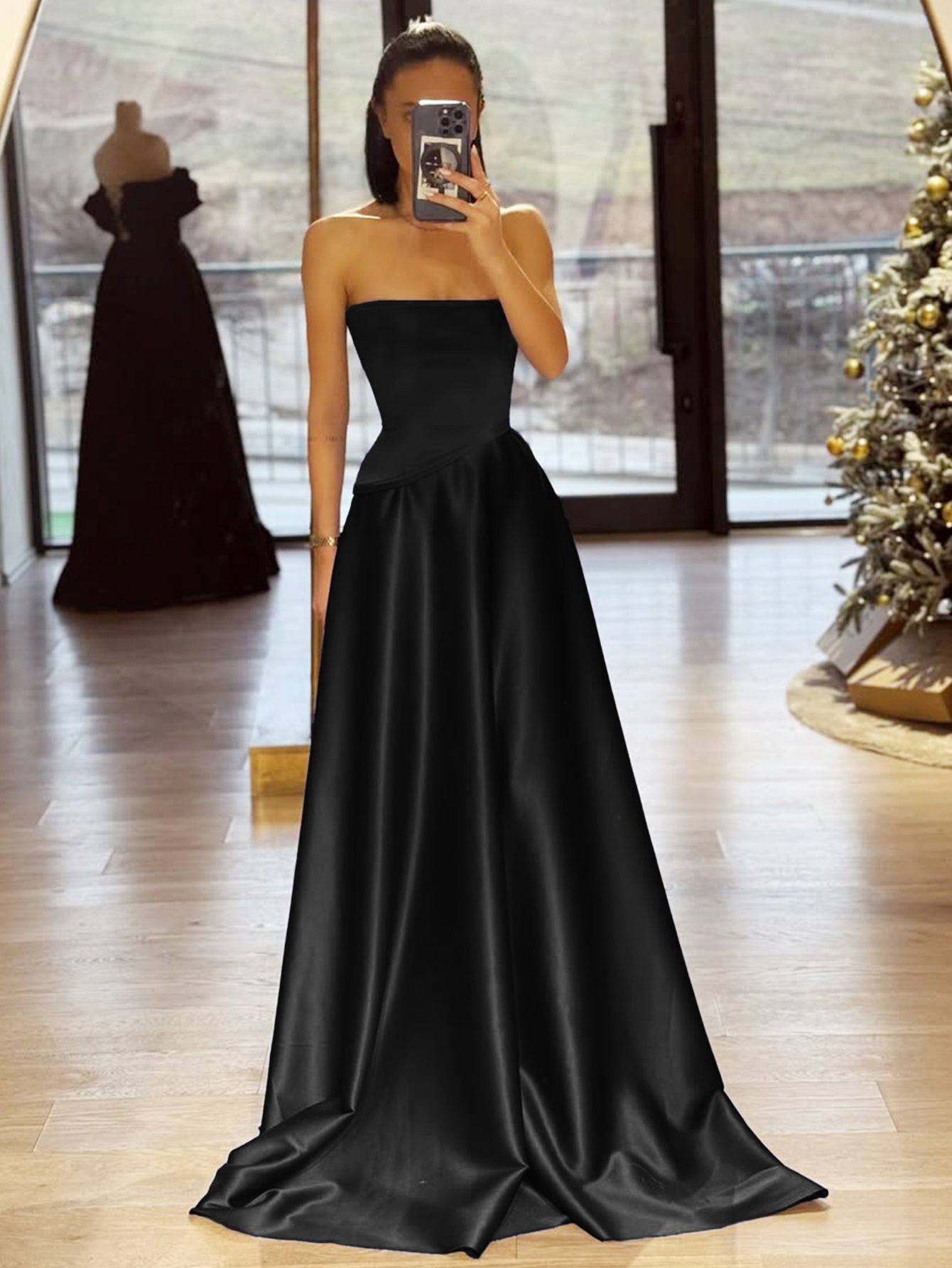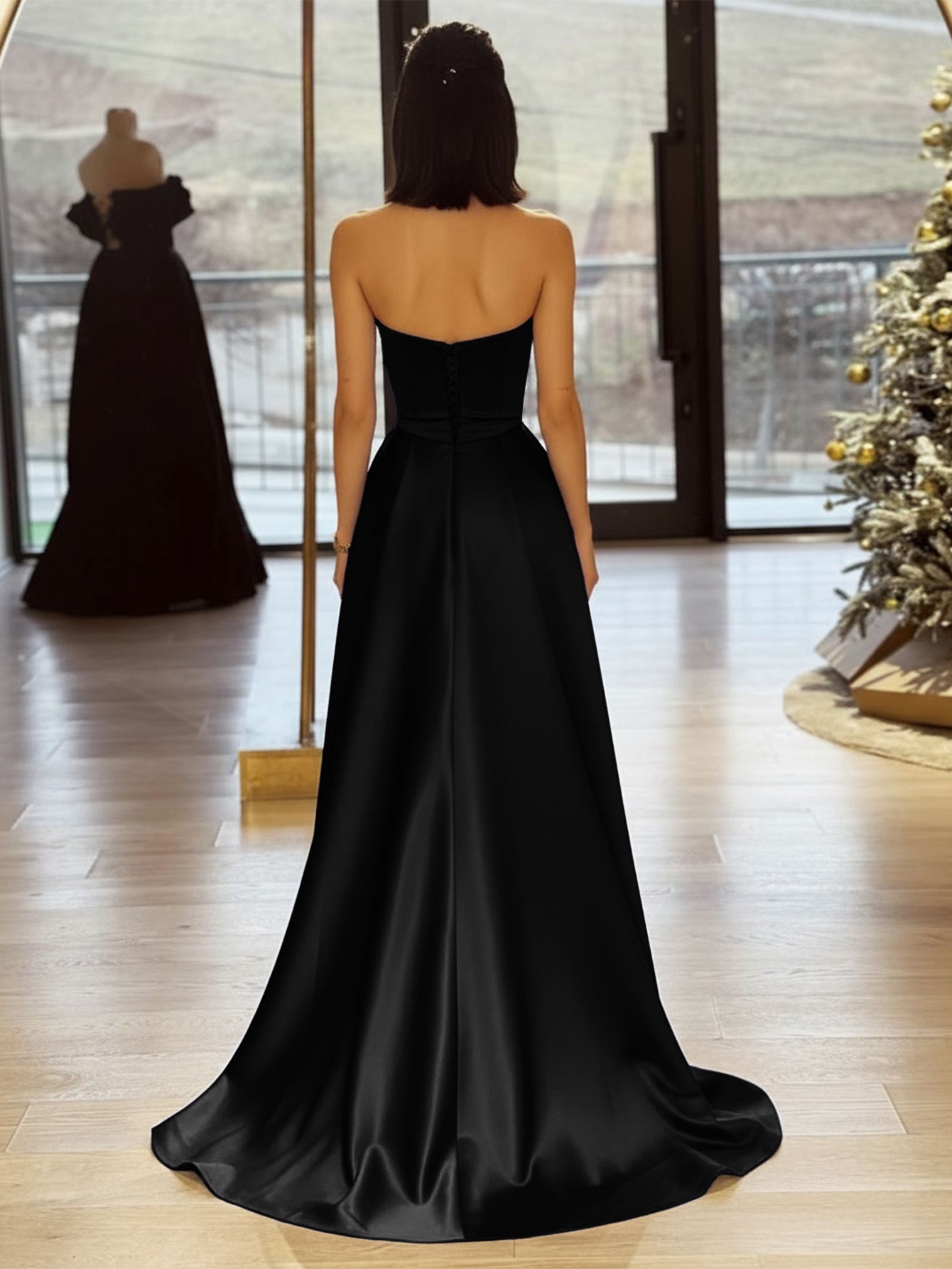 This satin prom dress features ruched waist on the bodice. The strapless ball gown dress has a pleated and split hem. Ruched dresses are ideal for party, evening or festivals.