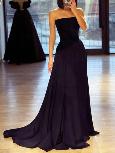 This satin prom dress features ruched waist on the bodice. The strapless ball gown dress has a pleated and split hem. Ruched dresses are ideal for party, evening or festivals.
