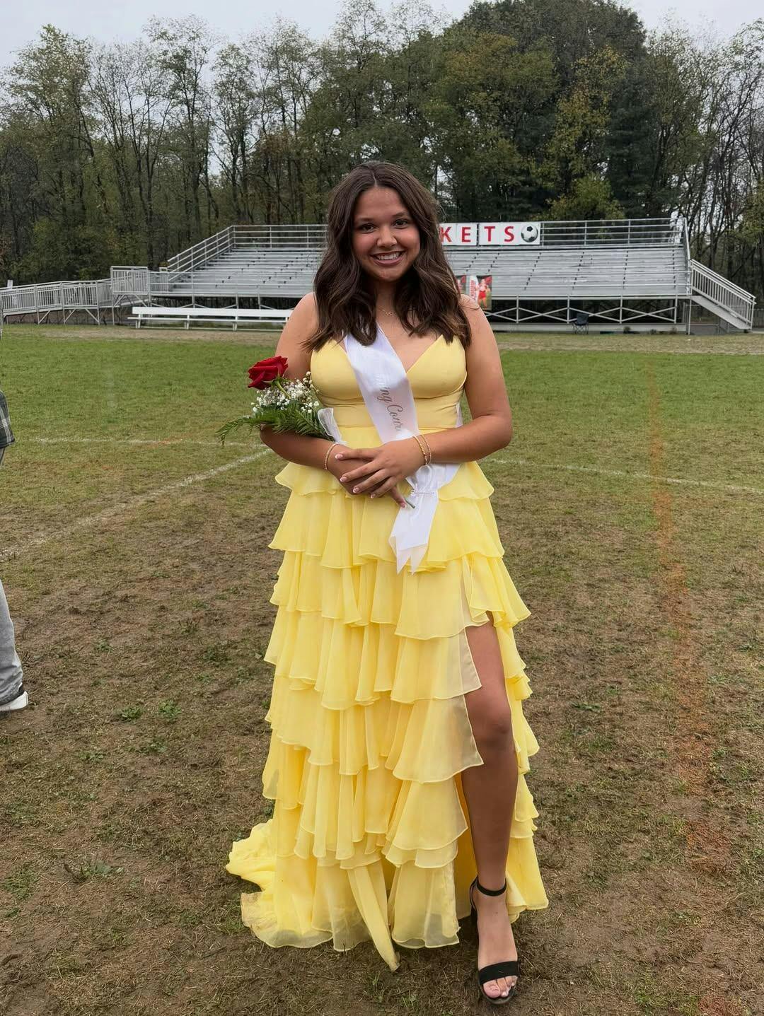 Details: Backless, Fitted Waist, Split, Tiered, Ruffle
