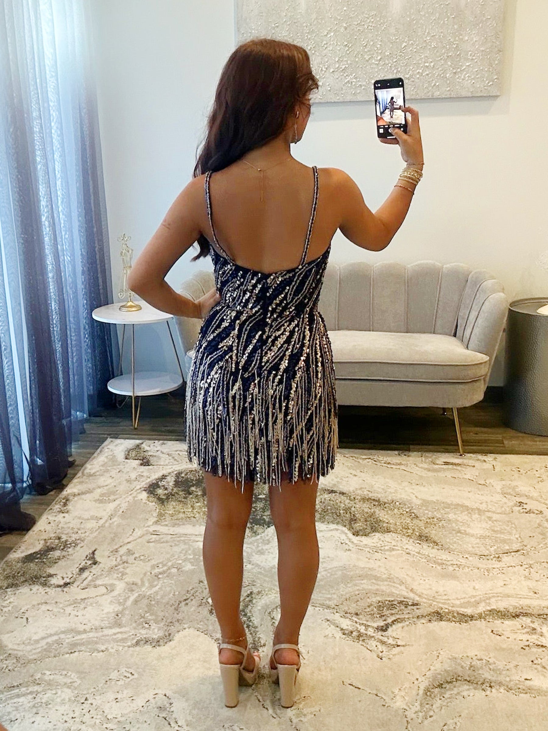 V-Neck Crystal Sheath Mini Prom Dress-Navy Blue