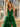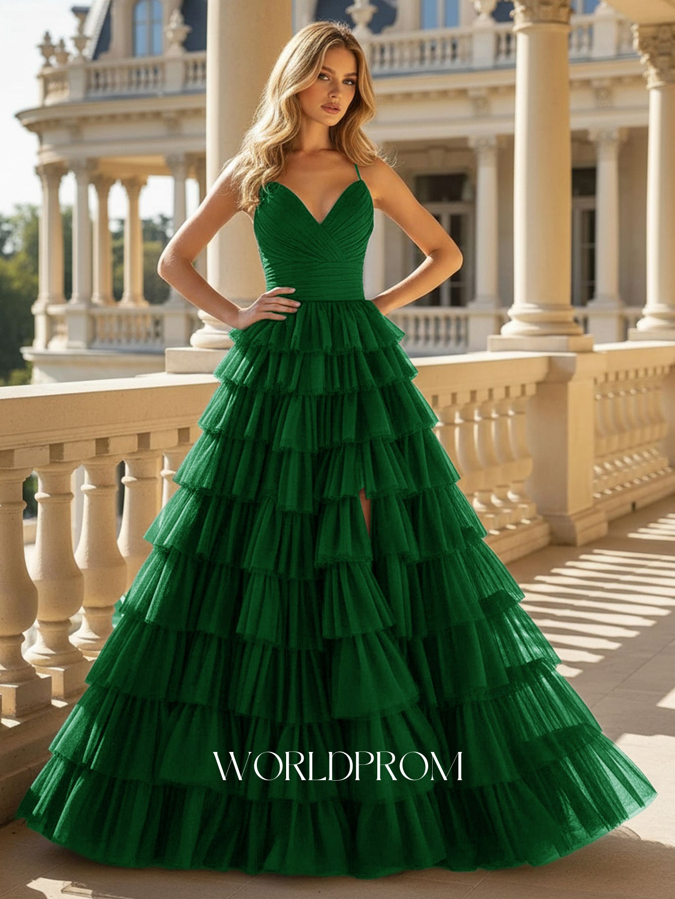V-Neck Spaghetti Strap Tulle Layered Ball Gown Prom Dress With Slit - Emerald Green