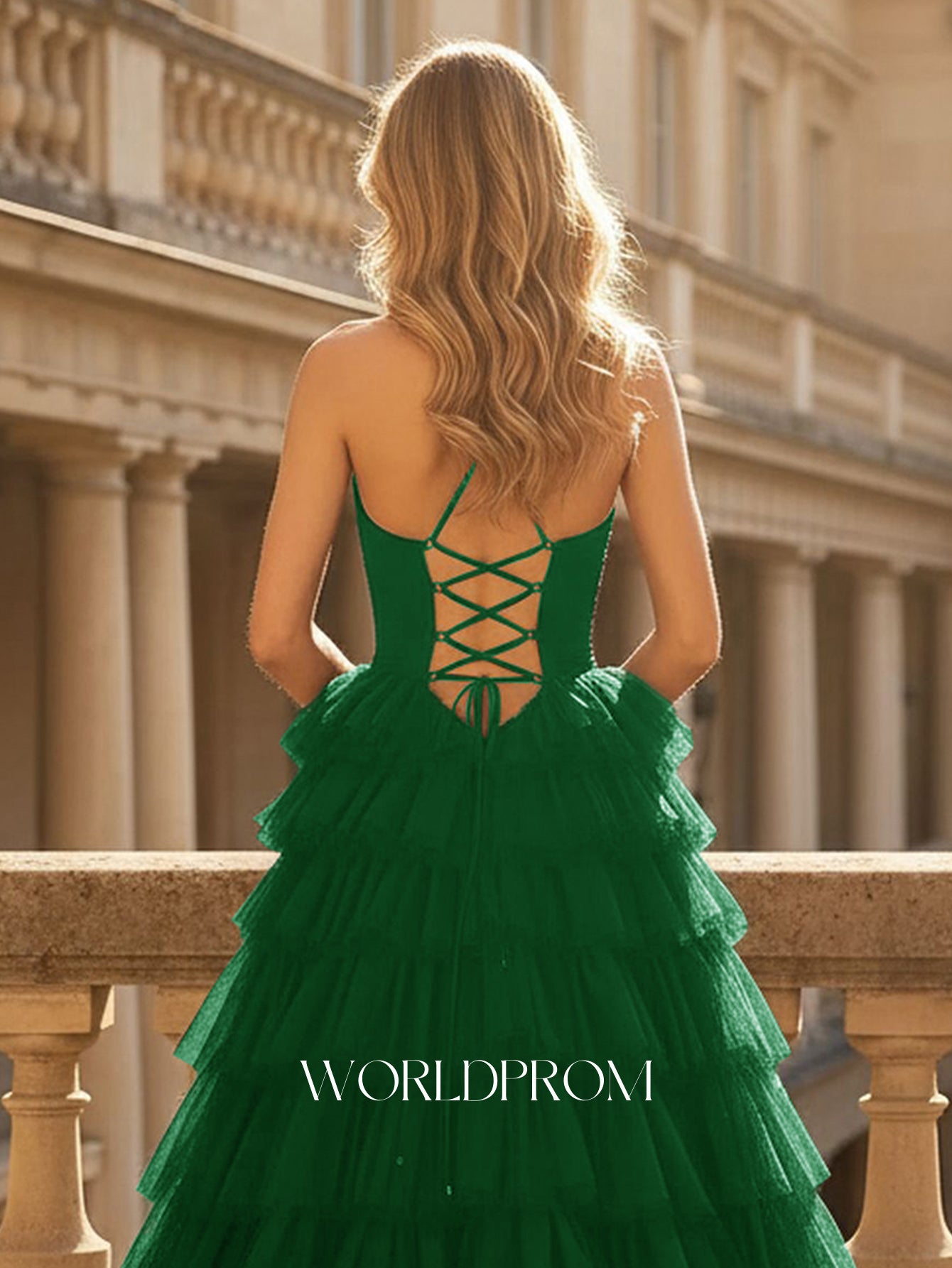 This tulle prom gown features corset and lace up on the bodice. The spaghetti straps dress for prom has a v-neck and layered ruffle hem. This prom gown is ideal for party, evening, anniversary party, birthday party, cocktail, graduation party or homecoming events.