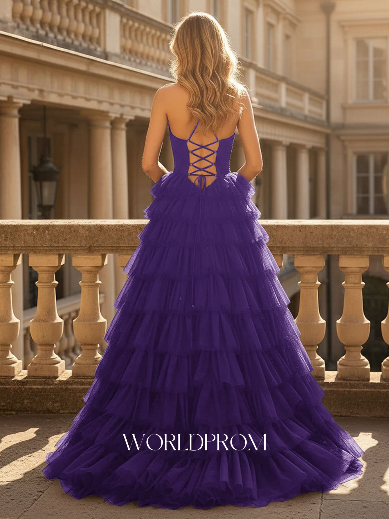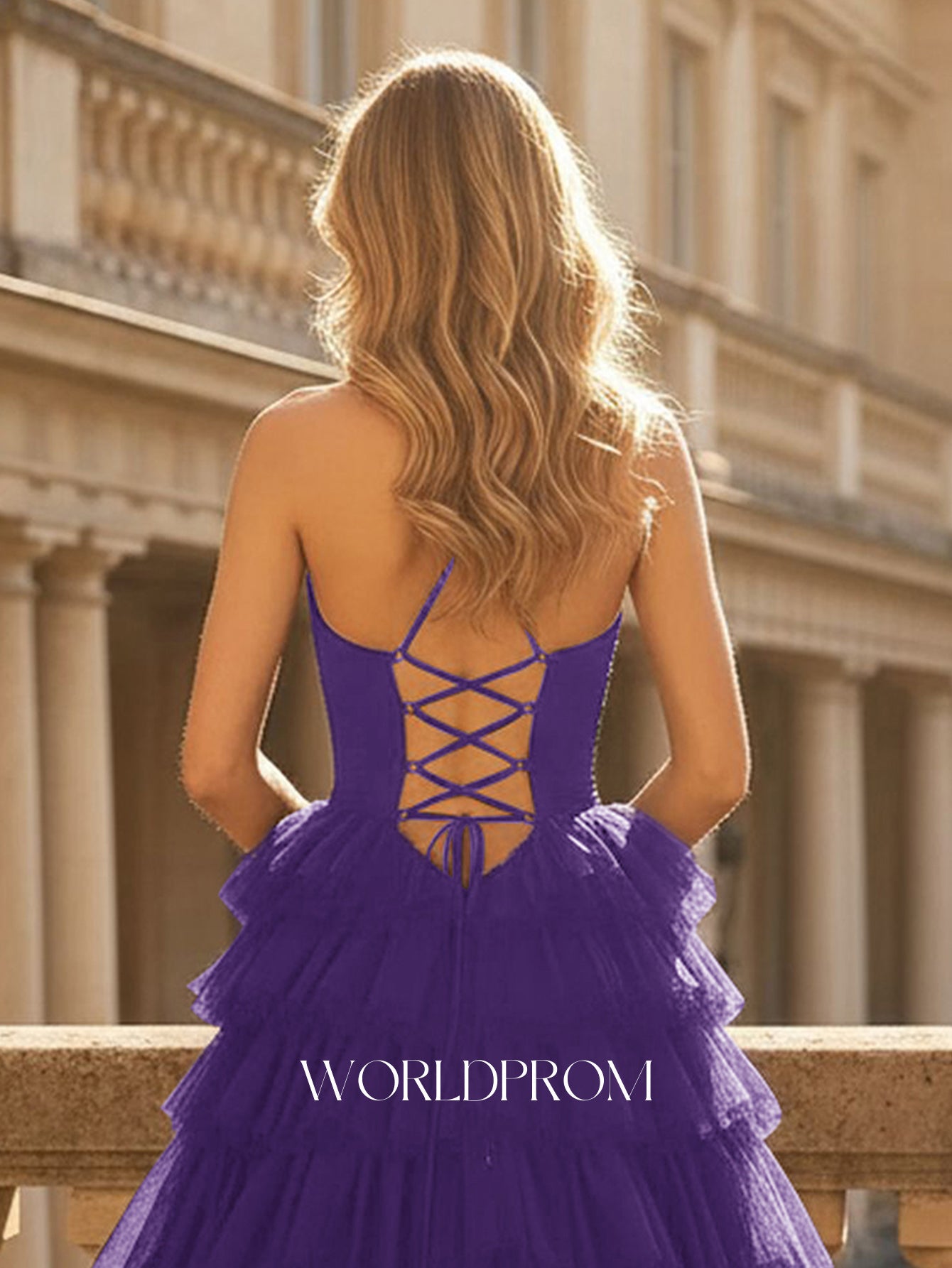 This tulle prom gown features corset and lace up on the bodice. The spaghetti straps dress for prom has a v-neck and layered ruffle hem. This prom gown is ideal for party, evening, anniversary party, birthday party, cocktail, graduation party or homecoming events.