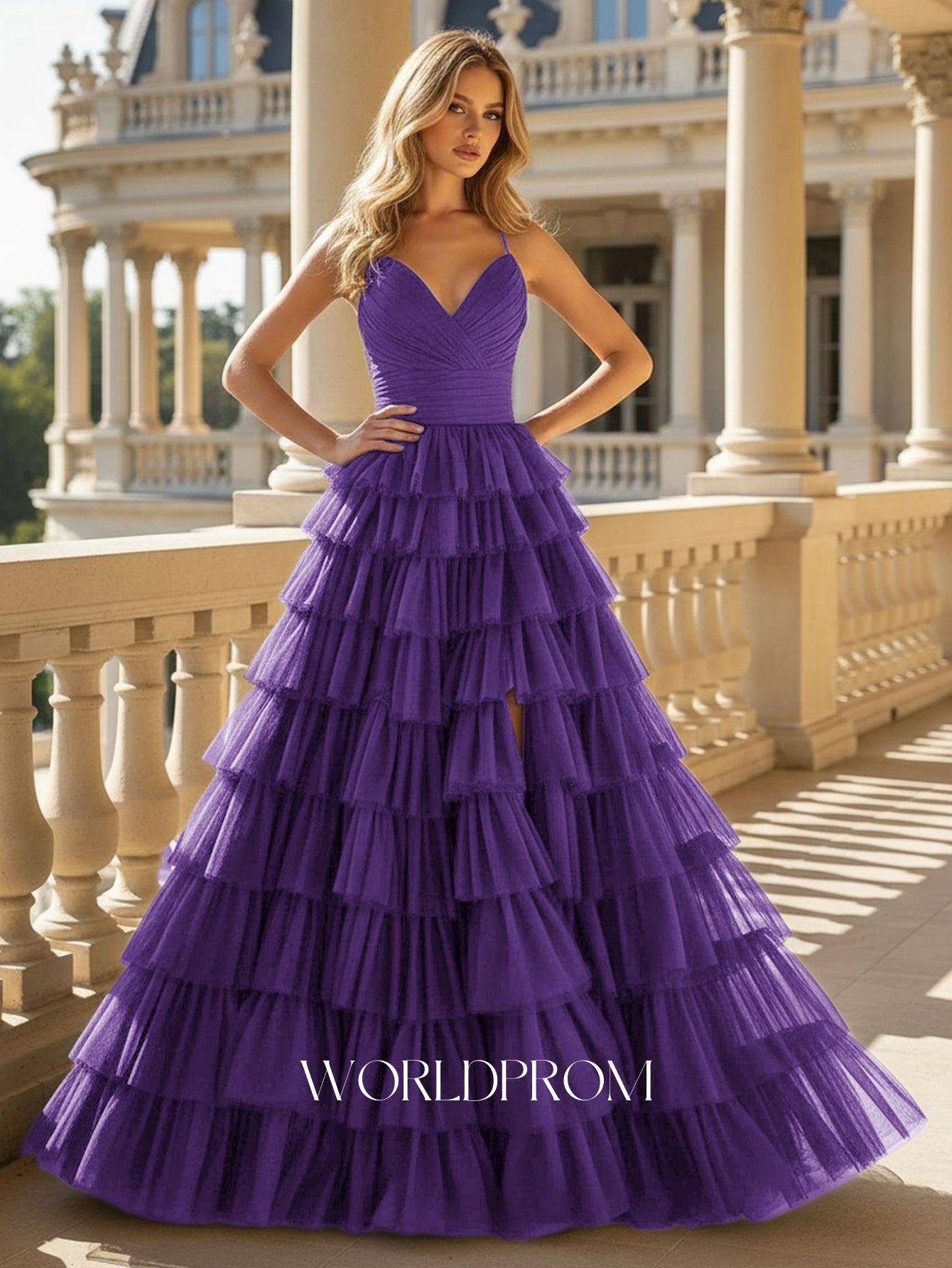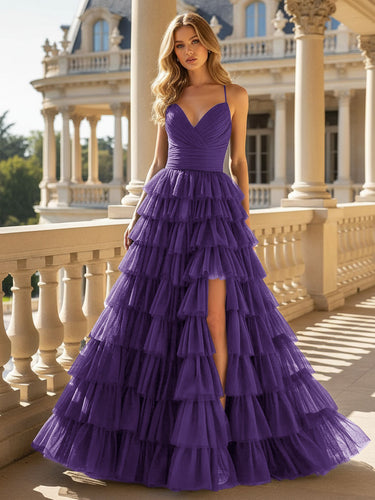 V-Neck Spaghetti Strap Tulle Layered Ball Gown Prom Dress With Slit - Purple